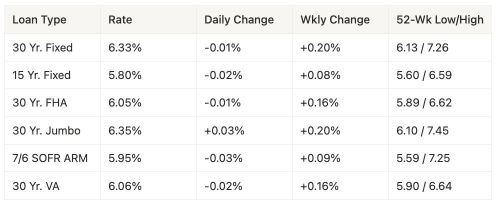 ⚡Snapshot: Rates inched slightly lower today across most loan types, except Jumbos, which ticked up +0.03%. Declines were minor (-0.01% to -0.02%), and weekly trends are still higher, suggesting a pause rather than a meaningful reversal.