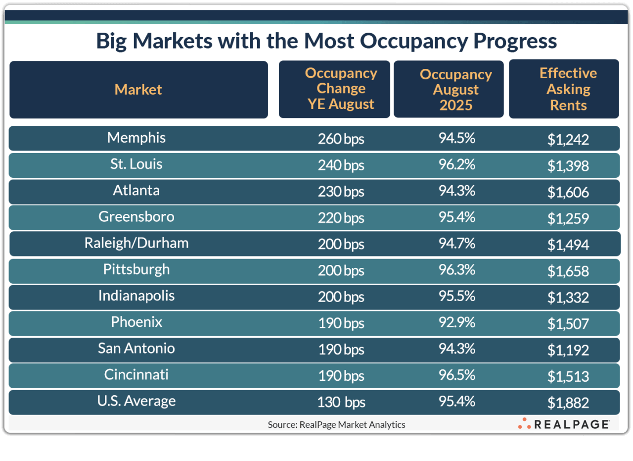 Memphis topped the nation in occupancy gains among the 50 largest apartment markets, climbing 260 bps year-over-year, with average rents of $1,242, far below the national mean.