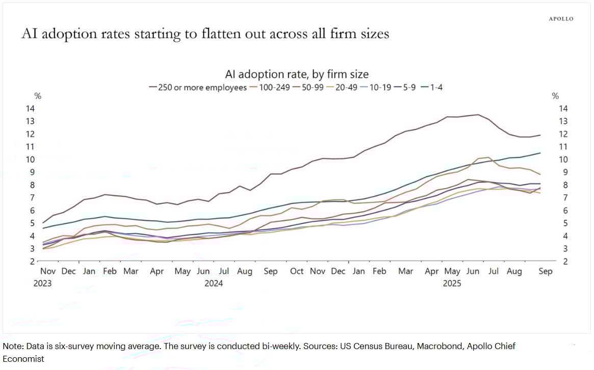 My take: A plateau in adoption means productivity gains from AI may cool a bit from the early spike, thus softening expectations for a big near-term boost to economic growth.