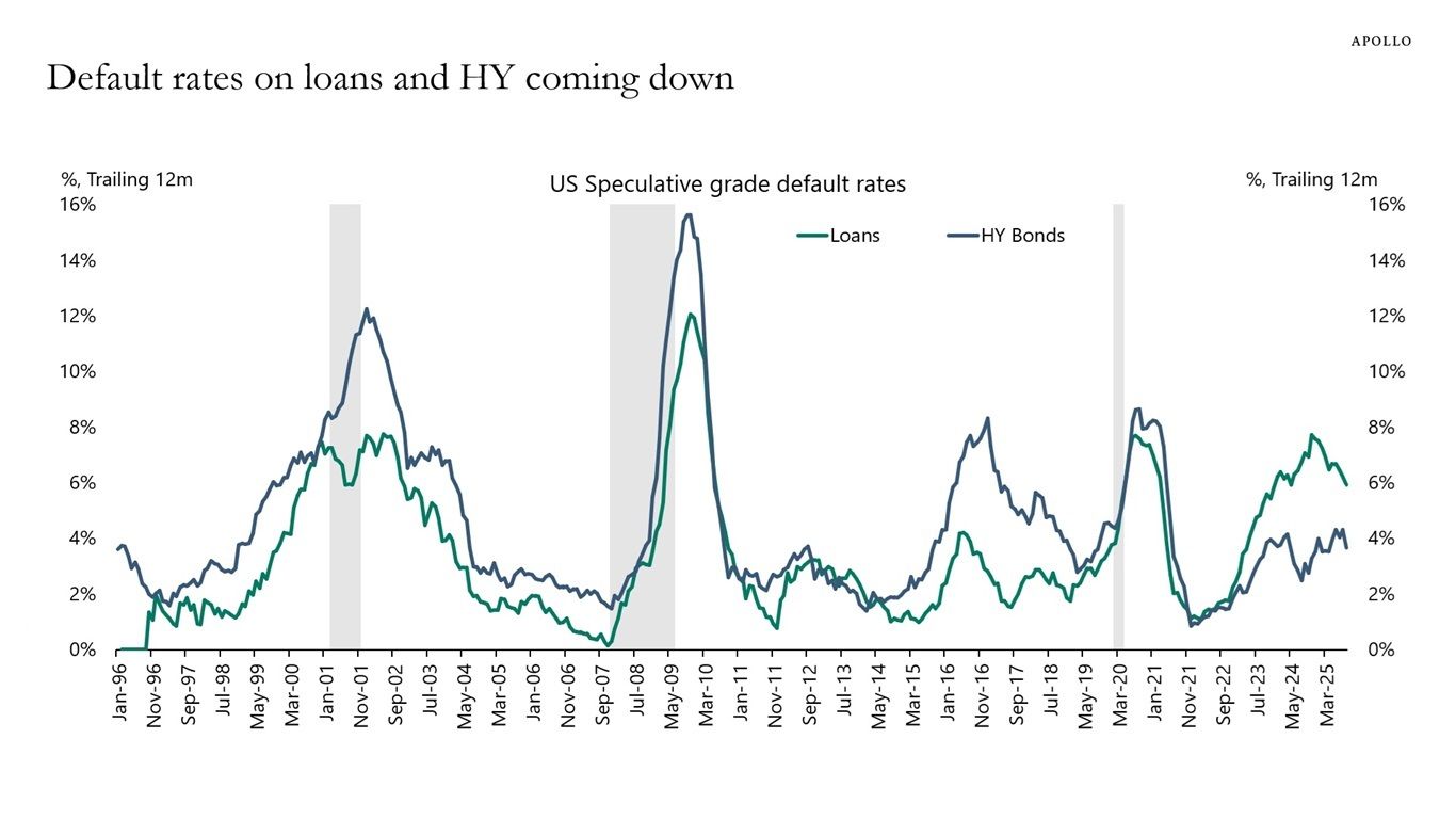 Default rates for high-yield debt and consumer loans have already peaked, signaling a turning point in credit stress. Moody’s and Fed data show both corporate and household delinquencies easing after months of steady climbs.