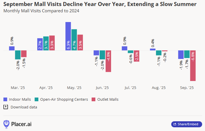 September broke the summer streak: indoor mall visits fell 1.9% YoY, outlets dropped 6.85%, and open-air centers slipped 1.7%. One fewer Sunday vs. 2024 likely dragged results, outlets get ~18.2% of visits on Sundays vs. ~16% indoor and ~15.4% open-air.